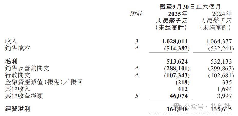 先看最直观的数字。截至2025年9月30日止六个月,颖通实现总收入10.28亿元,同比下滑3.4%;同期利润为1.33亿元,同比增长15.3%;毛利为5.14亿元,毛利率维持在约50%的水平,与上年同期基本持平。收入略有回落、利润却逆势增长,这样的结构,决定了这份财报不能只看表面。